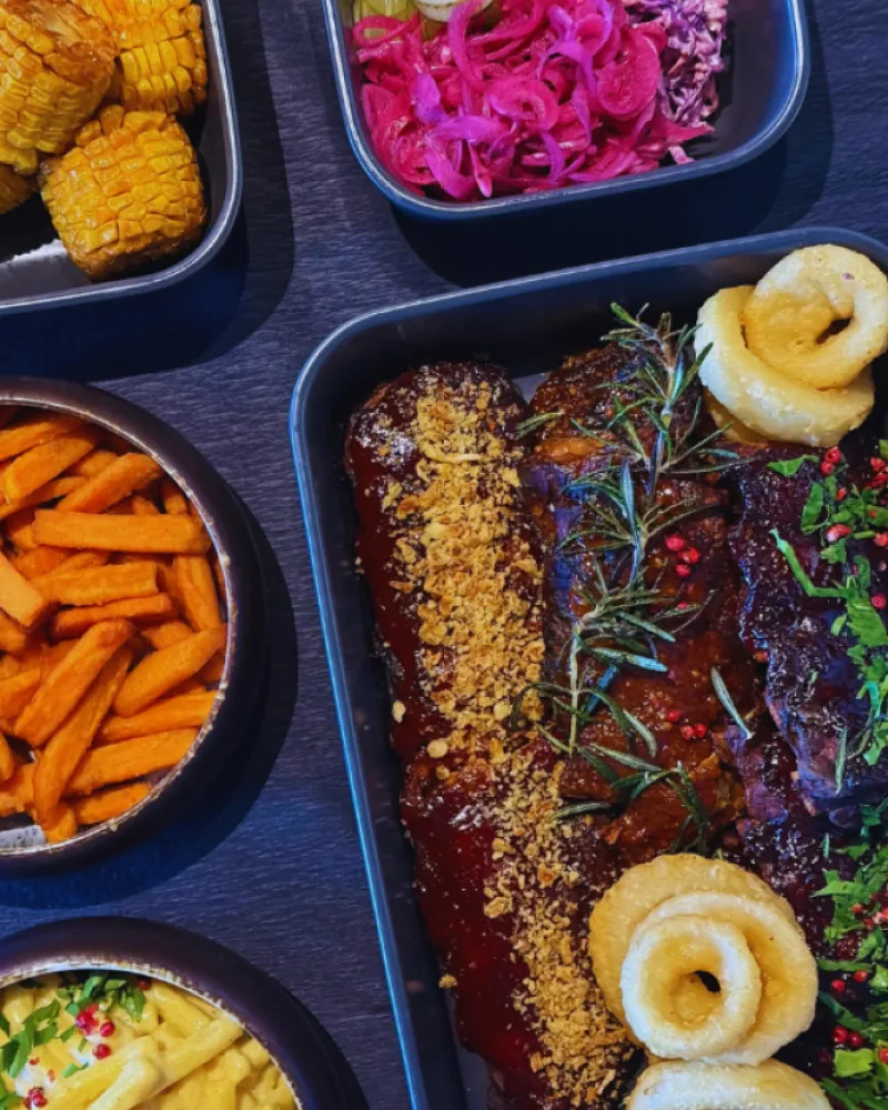 Puikiai tinkantis jaukiam šeimos stalui – minkšti, sultingi, patogūs dalintis. Trijų rūšių šonkauliukai: Kanzaso stiliaus, amerikietiški klasikiniai ir medaus–garstyčių. Kartu patiekiamos gruzdintos bulvių ir saldžiųjų bulvių lazdelės, kepti svogūnų žiedai tešloje bei kukurūzo burbuolės. Šalia patiekiamos „coleslaw“ salotos, marinuoti raudonieji svogūnai, konservuoti agurkai ir „pepperoni“ pipirai.