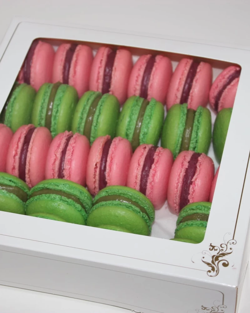 pistacijų-aviečių,su mėlynuoju pelėsiniu sūriu, pasiflorų, aviečių, braškių, šokoladiniai su karamele, šokoladiniai su kava ir karamele, kokosiniai, žaliųjų citrinų-mėtų. .