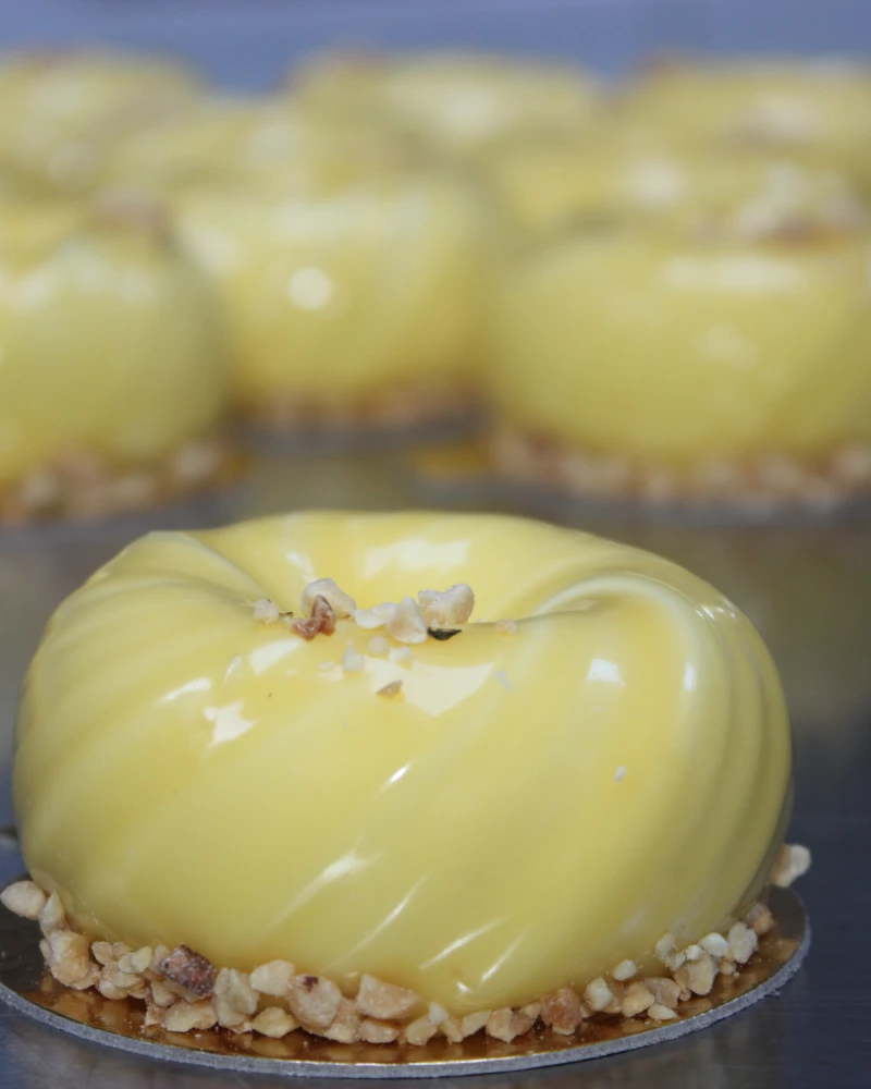 1. Gaivus putėsinis pyragaitis: biskvitas, mango ir pasiflorų viduriukas (gali būti kitų uogų), švelnus balto šokolado putėsių kremas.