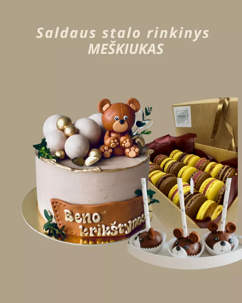 Teminis saldaus stalo rinkinys vaiko gimtadieniui ar krikštynoms. Torto bei desertų spalvą galime keisti, priderinti prie šventės temos.